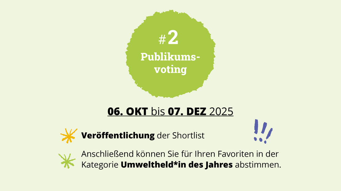 Bis zum 24. August 2025 können Personen sich selbst oder andere Kandidat*innen nominieren. Das Publikum stimmt dann vom 6. Oktober bis 7. Dezember 2025 über die Preisträger*innen der Kategorie "Umweltheld*in des Jahres" ab. Das Ergebnis dieser Publikumsentscheidung fließt in der darauffolgenden finalen Jurysitzung gleichwertig zu den Stimmen der Jury ein.