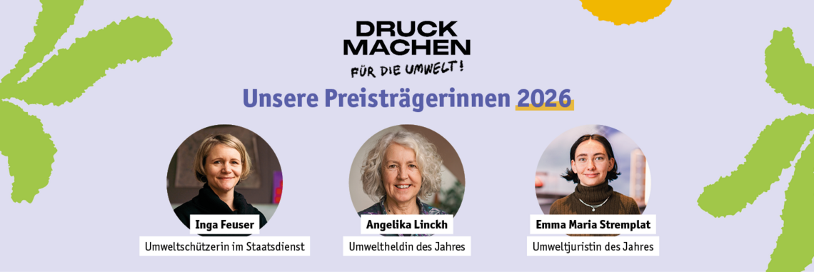 Am 12. März 2026 war es endlich so weit: Vorhang auf für die Preisträgerinnen des „DRUCK MACHEN - Für die Umwelt“-Engagementpreises im Museum für Kommunikation Berlin! Der Abend war ein unvergessliches Erlebnis – ein Fest der Emotionen, des Mutes und der Hoffnung. In festlicher Atmosphäre feierten wir Menschen, die durch ihr unermüdliches Engagement für den Umwelt- und Klimaschutz inspirierende Vorbilder sind. Gänsehaut-Momente prägten die Preisverleihung, die uns einmal mehr bewusst machten, wie entscheidend es ist, auch in Zeiten der Unsicherheit und Herausforderung standhaft zu bleiben. Diese Nacht war mehr als eine Feier: sie war ein Aufruf, gemeinsam für eine bessere und gerechtere Zukunft zu kämpfen, und ein starkes Zeichen dafür, dass jede noch so kleine Tat zählt, wenn es darum geht, die Welt zum Besseren zu verändern.