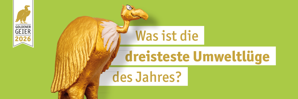 Das nehmen wir nicht hin! Aus diesem Grund haben wir den Goldenen Geier ins Leben gerufen, einen Schmähpreis für die dreisteste Umweltlüge. Das Ziel: Unternehmen zu enttarnen, die Umweltfreundlichkeit versprechen und das grüne Gewissen der Verbraucherinnen und Verbraucher für ihre Profite ausnutzen. Einmal im Jahr vergeben wir den Goldenen Geier und zählen auf deine Unterstützung!