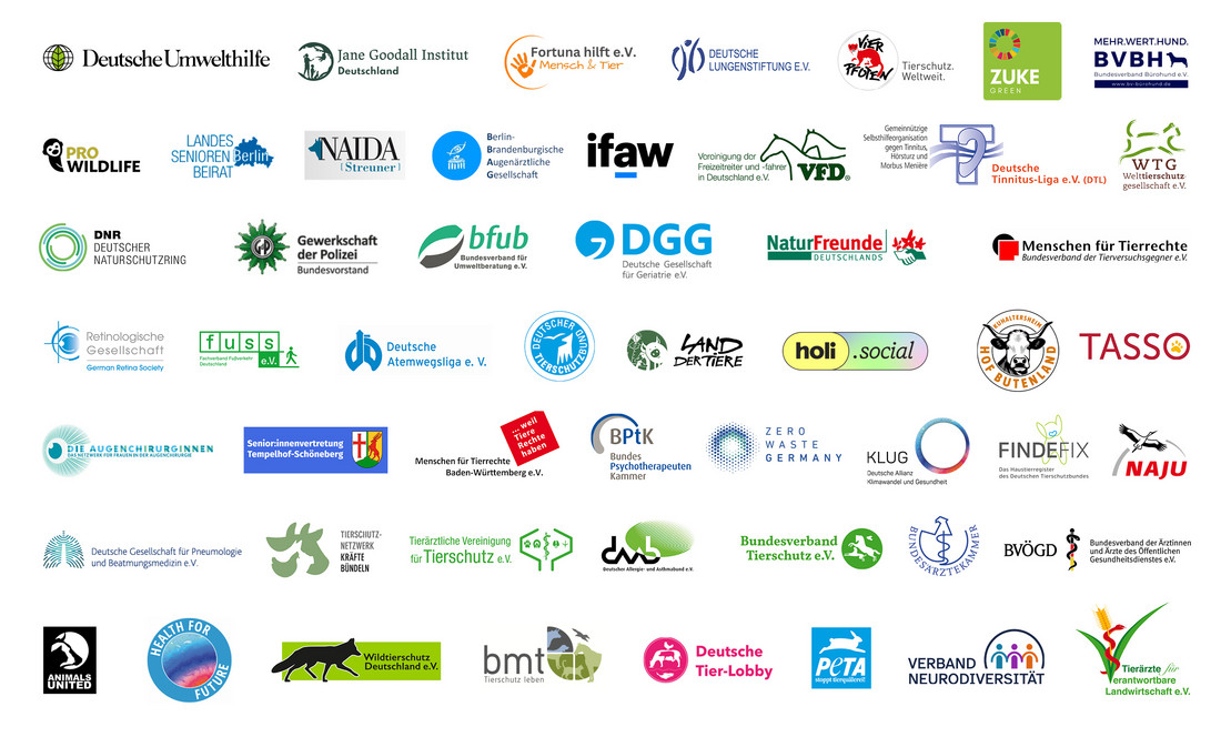 Deutsche Umwelthilfe, Gewerkschaft der Polizei, Bundesärztekammer, VIER PFOTEN – Stiftung für Tierschutz, TASSO, Jane Goodall Institut Deutschland, Deutscher Tierschutzbund, PETA Deutschland, Bundesverband der Ärztinnen und Ärzte des öffentlichen Gesundheitsdienstes, Menschen für Tierrechte - Bundesverband der Tierversuchsgegner, Menschen für Tierrechte - Baden-Württemberg, Bundesverband Tierschutz e.V., NaturFreunde Deutschlands, Tierschutznetzwerk Kräfte bündeln, Pro Wildlife e.V., Tierärzte für verantwortbare Landwirtschaft e. V., Deutsche Tinnitus-Liga e.v., Bundesverband Bürohund e. V., Haustierregister FINDEFIX, Deutscher Naturschutzring (DNR) e. V., Retinologische Gesellschaft e. V., Welttierschutzgesellschaft e. V., Berlin-Brandenburgische Augenärztliche Gesellschaft, Land der Tiere, Tierärztliche Vereinigung für Tierschutz e. V., Wildtierschutz Deutschland e. V., Deutsche Atemwegsliga, Deutsche Lungenstiftung, Deutsche Gesellschaft für Pneumologie und Beatmungsmedizin (DGP), Vereinigung der Freizeitreiter und -fahrer in Deutschland e.V. (VFD), Senior*innenvertretung Tempelhof-Schöneberg, Die Augenchirurginnen, Landesseniorenbeirat Berlin, Animals United e. V., Deutsche Tier-Lobby, Fortuna hilft e. V., Stiftung Hof Butenland, Deutsche Gesellschaft für Geriatrie e. V., fuss e. V., KLUG - Deutsche Allianz Klimawandel und Gesundheit, NAJU (Naturschutzjugend im NABU), Health for Future, holi.social, Bundespsychotherapeutenkammer (BPtK), Verband Neurodiversität, Deutscher Allergie- und Asthmabund (DAAB), Bund gegen Missbrauch der Tiere e.V., International Fund for Animal Welfare (IFAW), Bundesverbands für Umweltberatung (bfub) e.V., Zero Waste Germany e. V., Naida e.V., Tierschutz-Entwicklungshilfe e.V., Andreas Reuland (Augenarzt), Norbert Mülleneisen (Facharzt für Lungen- und Bronchialheilkunde und Umweltmediziner)